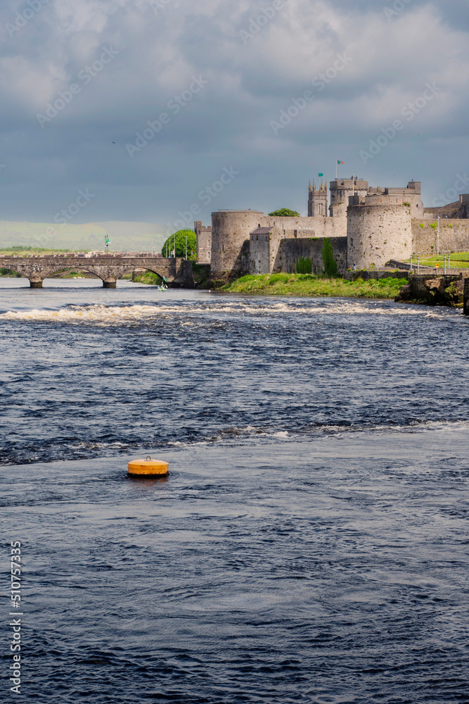 Stunning medieval King John castle on river Shannon, Limerick city, Ireland. Popular and famous tourist landmark. Vertical image