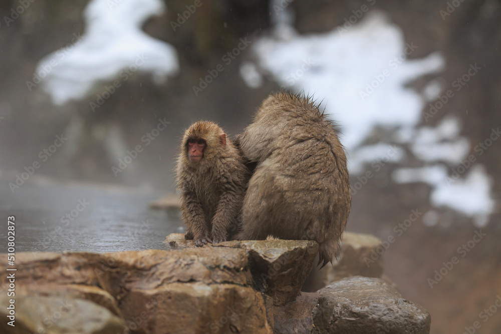 寒い冬に温泉に体を温めにやってくる猿の親子が毛繕いをしています Parents and children of monkeys who come to the hot springs to warm their bodies in the cold winter are grooming