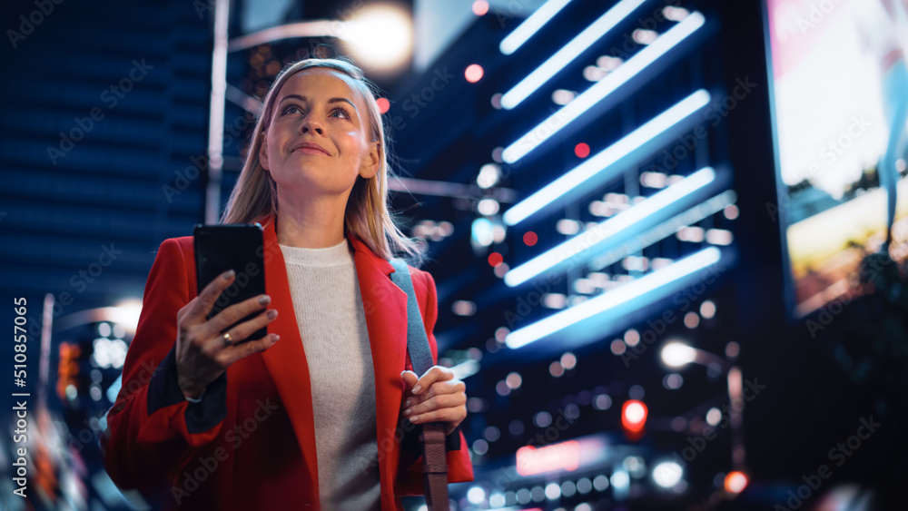 Portrait of a Beautiful Woman in Red Coat Walking in a Modern City Street with Neon Lights at Night. Attractive Female Using Smartphone and Looking Around the Urban Cinematic Environment.