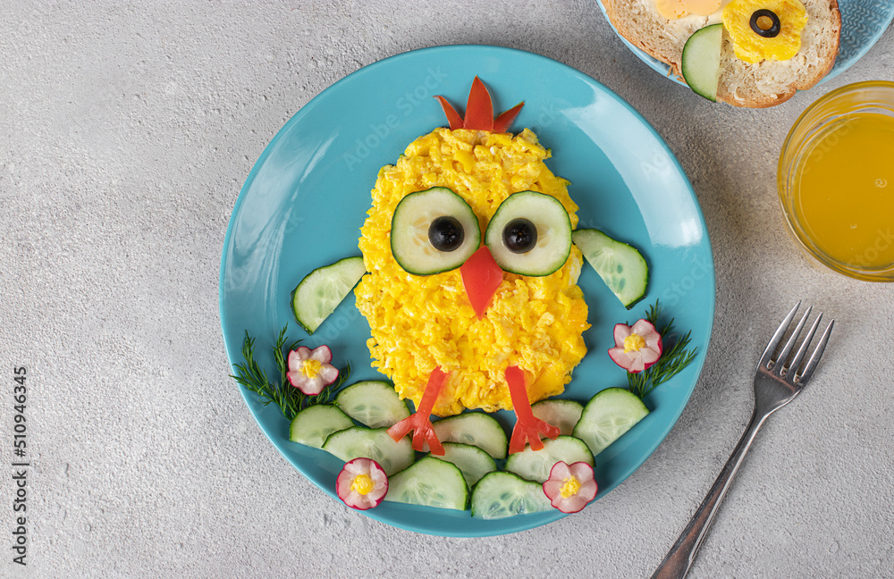 Fun food for kids - funny chicken made from scrambled eggs, cucumbers, tomatoes, olives and radishes. Creative healthy breakfast