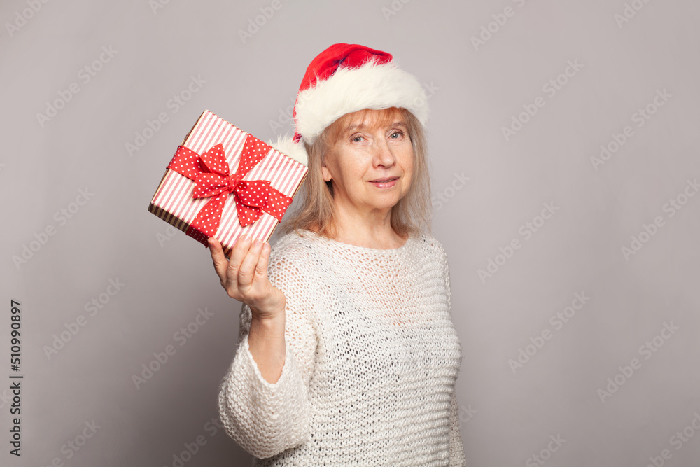 Senior woman wearing Santa Claus hat holding Christmas gift with red ribbon. Mature female celebrating Christmas