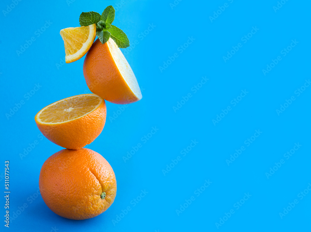 Oranges fruit stacked pyramid on the blue background. Copy space. Closeup.