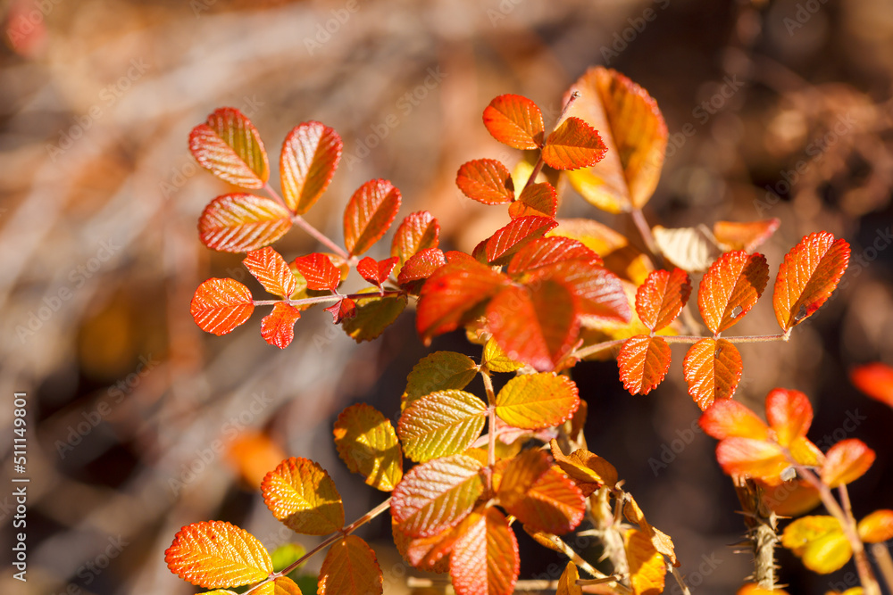 Autumn forest. Close-up. Autumn colored leaves against the background of the rising sun.