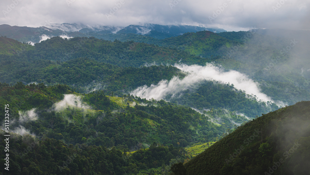Traveling and camping concept. Camping tent in forest near lake with grassland and blue sky at the morning. natural landscape in Thailand and Myanmar by natural border with forest mountain range.