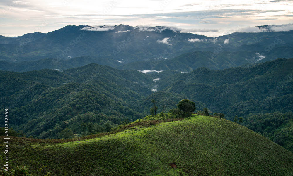 Traveling and camping concept. Camping tent in forest near lake with grassland and blue sky at the morning. natural landscape in Thailand and Myanmar by natural border with forest mountain range.