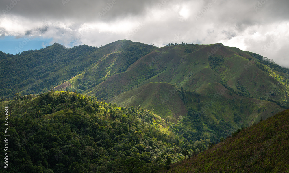 Traveling and camping concept. Camping tent in forest. Beautiful park scene in public park with green grass field, green tree plant and a party cloudy blue sky. forest between Thailand and Myanmar.