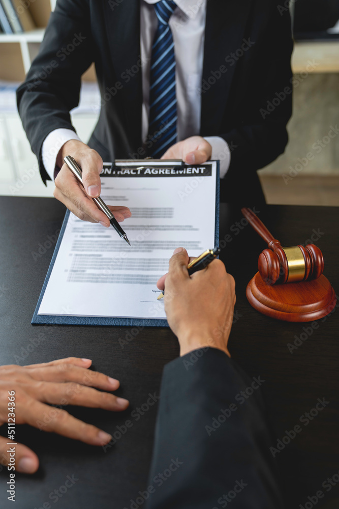 Attorney or judge consulting client's trial at attorney's office, litigation consultation ideas with lawyers.