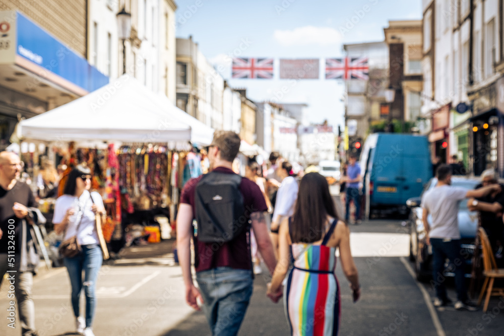 Defocussed London street scene of anonymous couple at street market