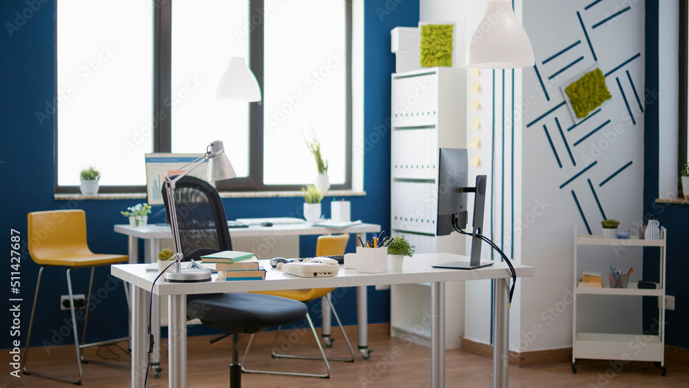 No people in professional business office with e commerce data on computer, used by people to plan financial economic strategy. Nobody in startup workplace with e commerce supplies.