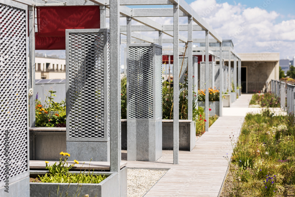 Rooftop terrace on the roof of high-rise apartment building in Europe. Recreation area on Roof of Skyscraper. Modern High terrace on Cityscape background.