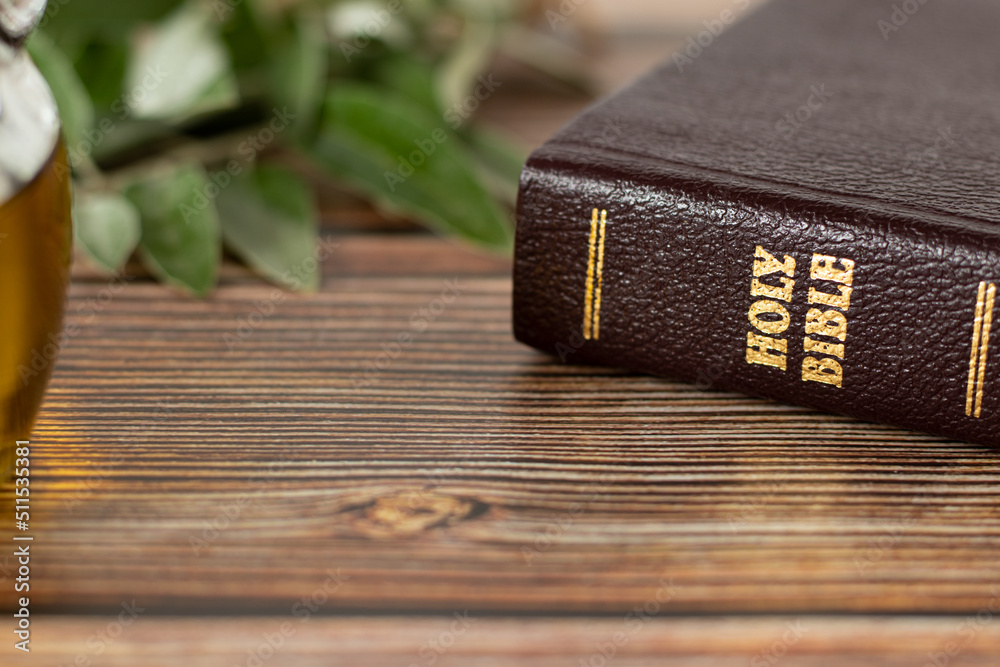 Holy Bible Book with golden text, green olive branch, and oil in a jar on a wooden table. Christian biblical concept of anointing, healing, and purity. Symbol of God's Holy Spirit. A closeup.
