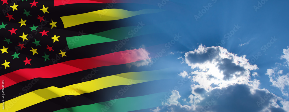 Alternative Juneteenth Flag with blue cloudy sky. Since 1865. Banner with place for text. 3D-rendering.