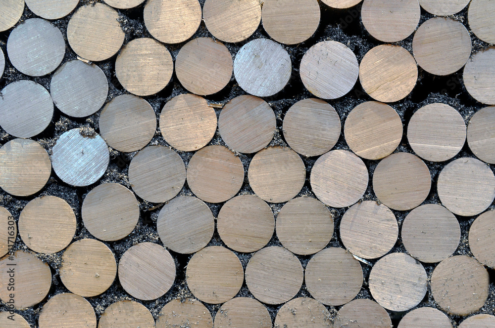 A bunch of thick steel rods sawn on a band saw in a factory. Background.