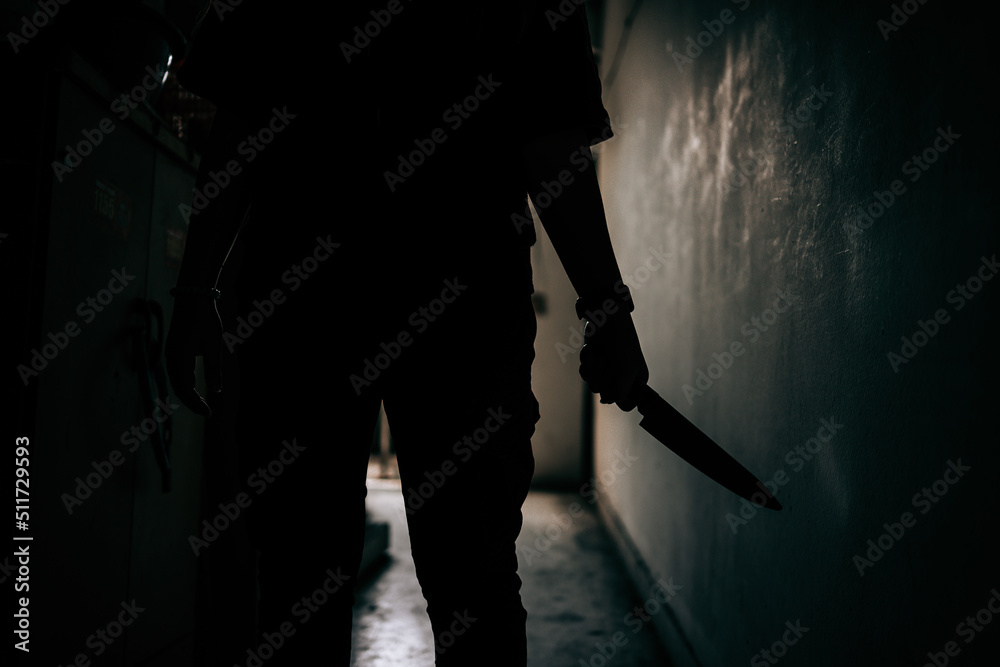 The shadow of a female murderer stood terrifyingly holding a knife and lit from behind.Scary horror or thriller movie mood or nightmare at night Murder or homicide concept.