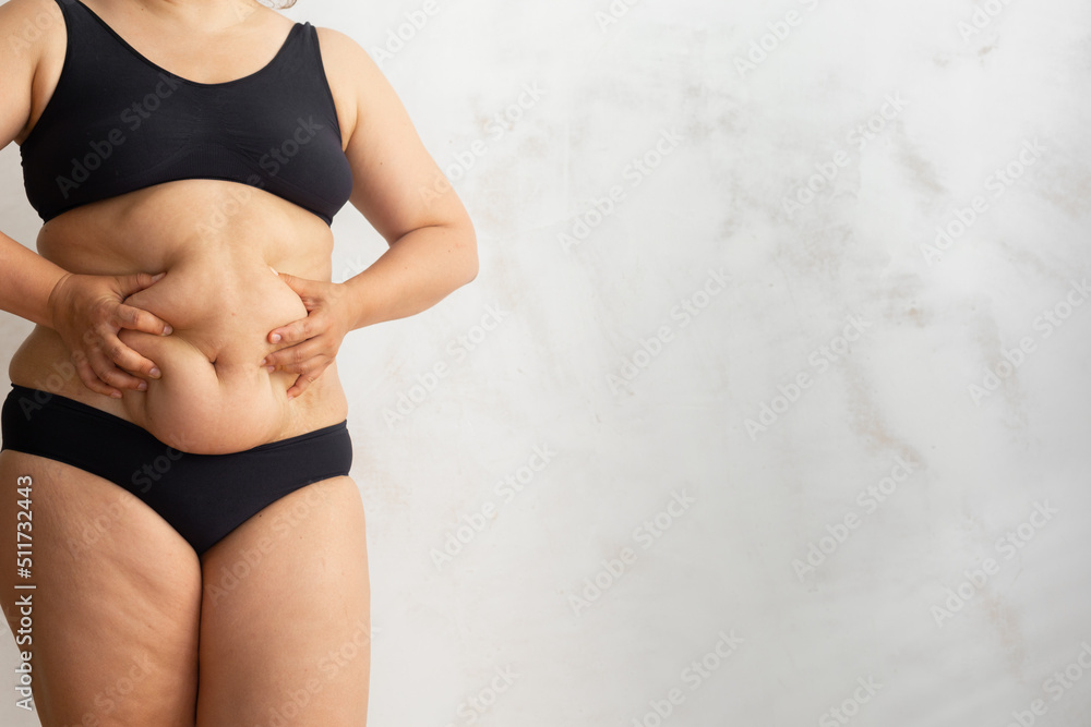 Unrecognizable overweight obese woman in black bikini touching and squeezing big dangling tummy. Hand self massage to dry friable cellulite skin. Body care. Food addiction, obsession, overeat problem
