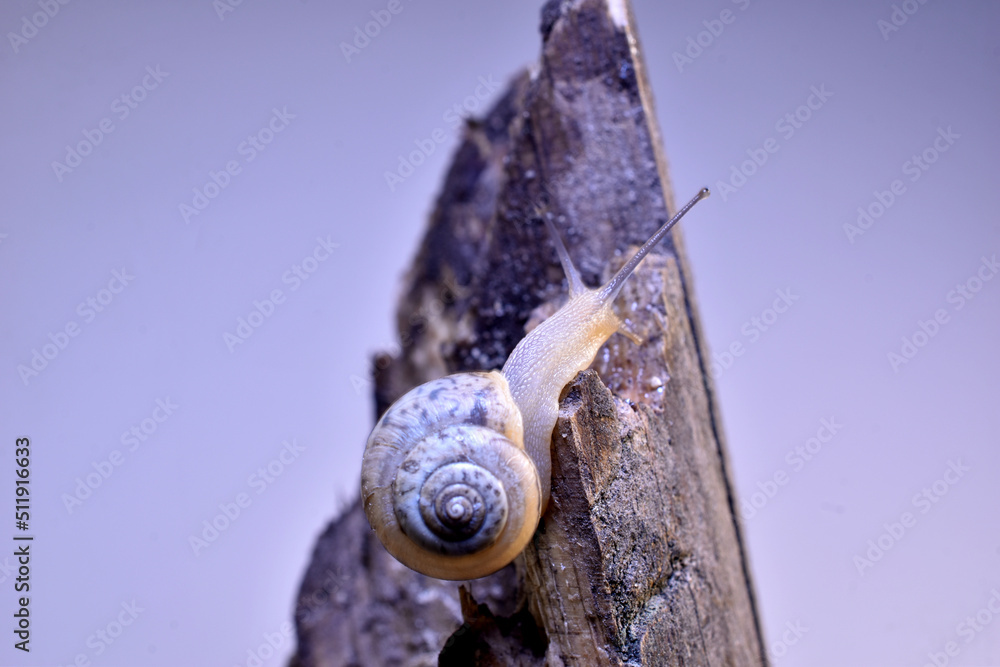 In the picture, a grape snail crawls to the top of a stump.