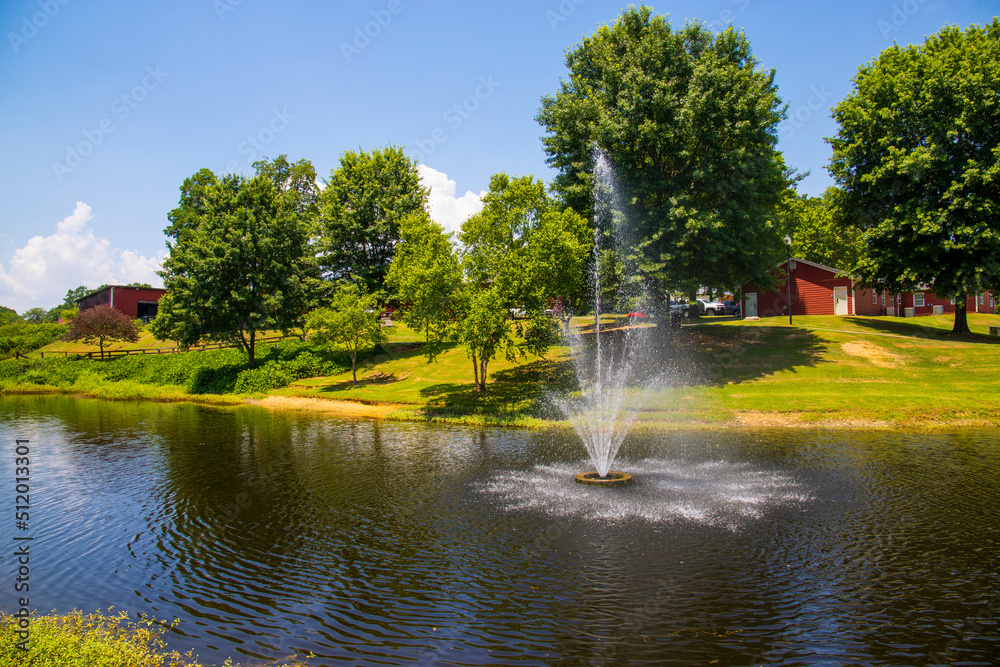 a gorgeous summer landscape in the park with a pond with a water fountain surrounded by lush green trees, grass and plants with blue sky and clouds at Logan Farm Park in Acworth Georgia USA
