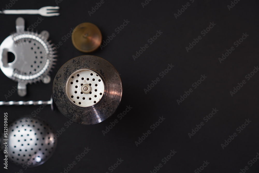 Old cocktail shaker and bartender tools onblack background with copy space, space for logo, bartender school concept
