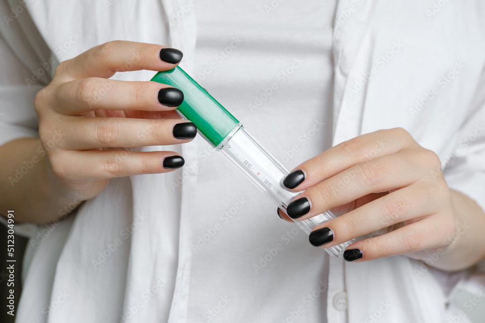A girl in a white coat holds a thermometer to measure body temperature, a medical worker, a nurse