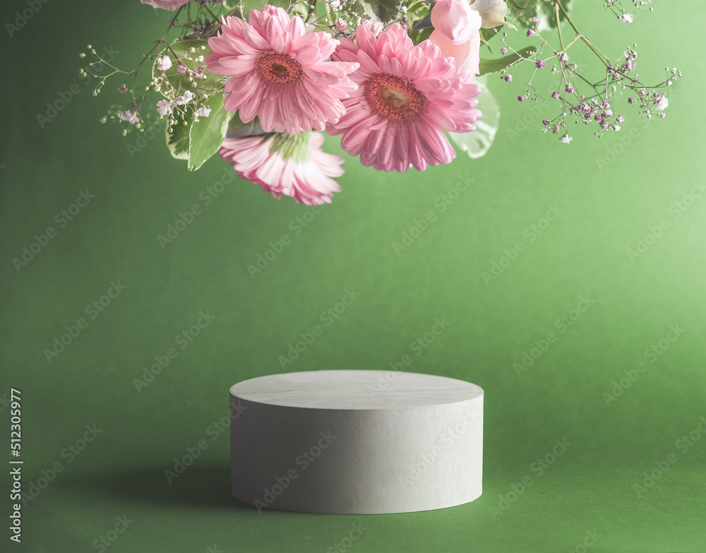 Beautiful minimal modern product display with podium and hanging pink flowers at green background. Place for beauty products or marketing campagne for fragrance. Front view