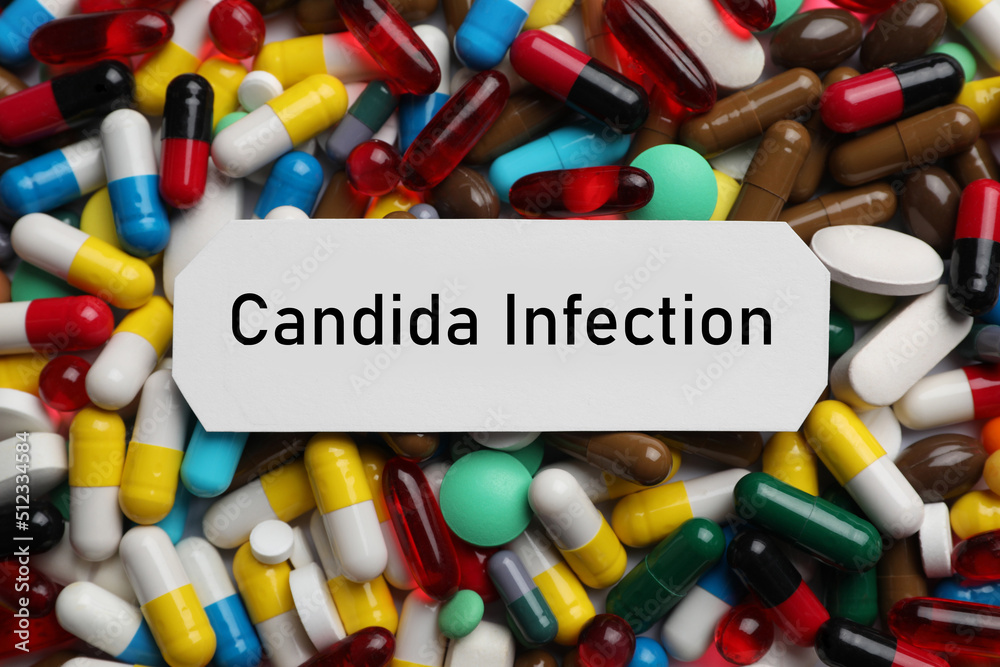 Sheet of paper with phrase Candida Infection on drugs, top view