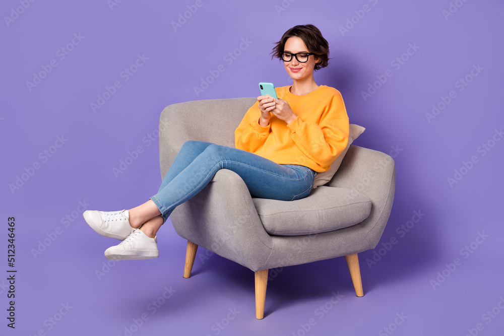 Portrait of attractive cheerful girl sitting using device communicating post video isolated over violet lilac color background