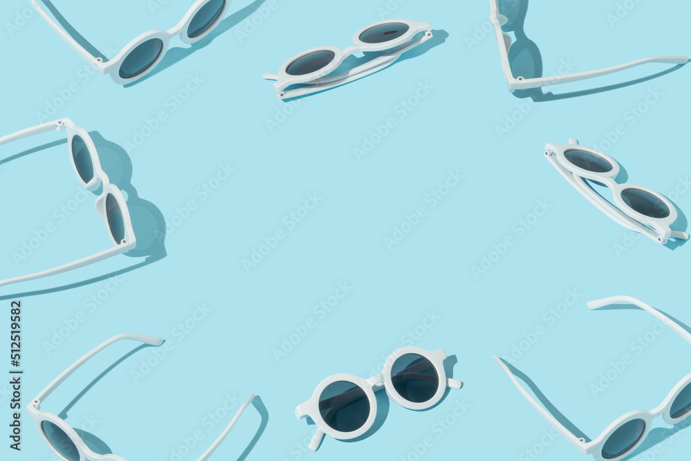 Summer creative pattern with white trendy sunglasses on pastel blue background. 80s or 90s retro aesthetic fun idea. Minimal summer fashion idea with copy space.