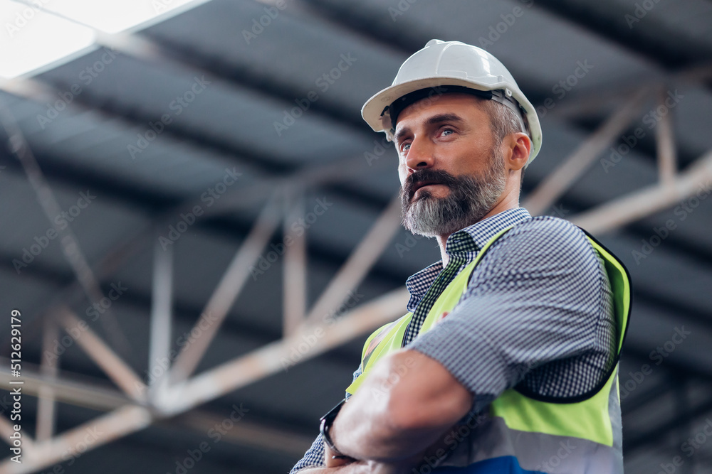 Portrait Caucasian professional Engineer factory. Engineering worker in safety hardhat at factory industrial facilities. Heavy Industry Manufacturing Factory