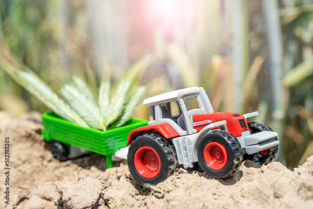 Agriculture concept with harvesting, tractor and money symbolizing about harvesting, earning money and productivity. Red tractor with grain trailer against the background of beds with wheat