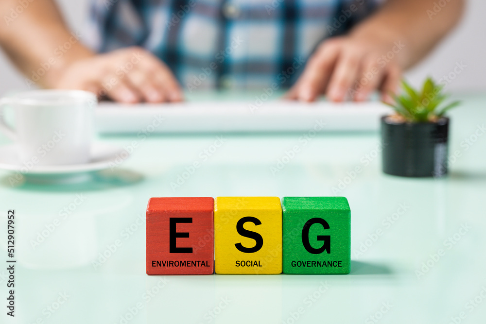 ESG inscription on the wooden blocks, enviroment, social responsibility,corporate governance, Sustainable development of the organization, A man sitting behind a computer keyboard