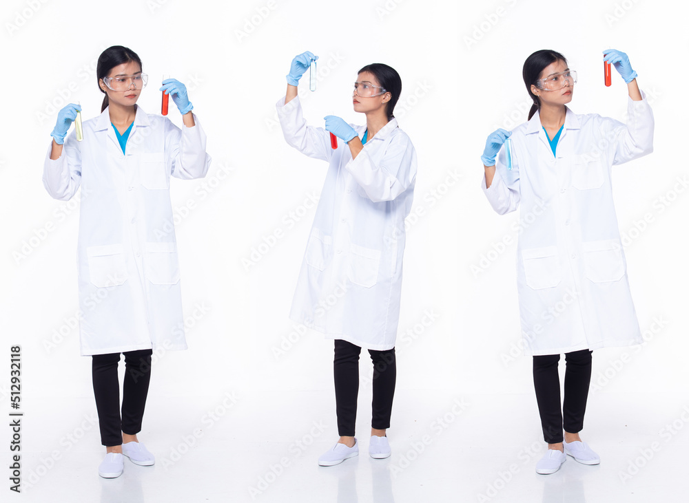 Full length 30s Asian Woman scientist science Doctor, working hard thinking,