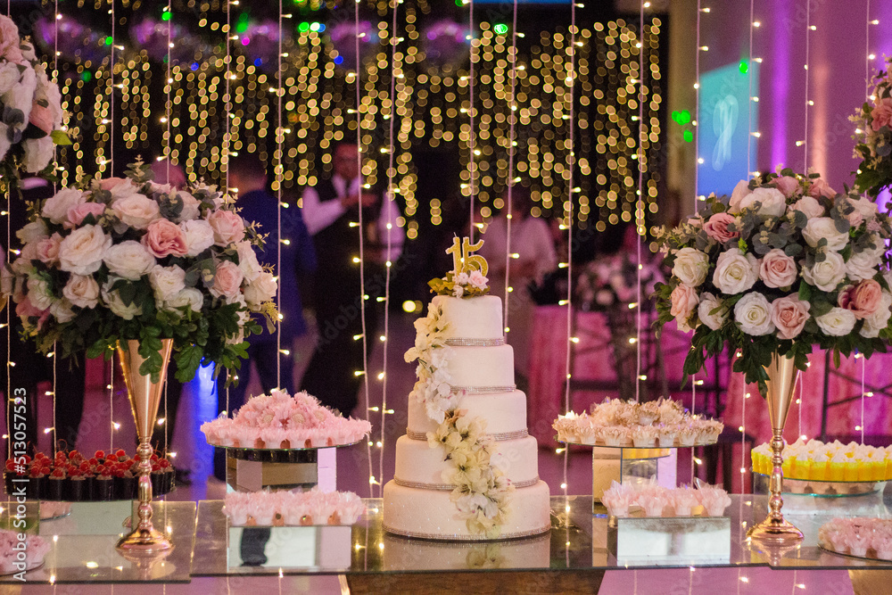 festa de 15 anos com cortina de luzes e bolo de 5 andares