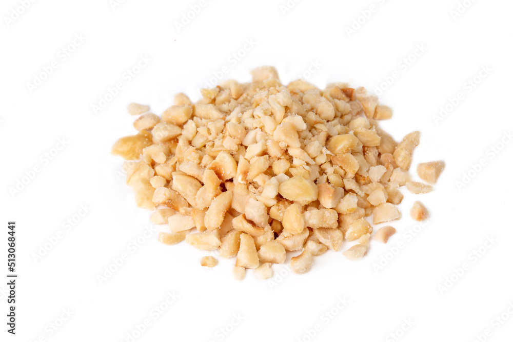 Freshly chopped Hazelnuts as detailed close up shot isolated on white background (selective focus)