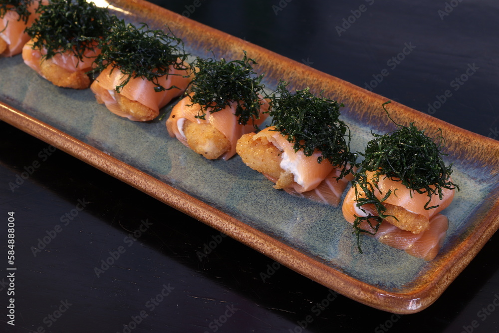 Fiery-throated hummingbird (Panterpe insignis) and other hummingbirds on a stick at the high altitude Paraiso Quetzal Lodge outside of San Jose, Costa Rica