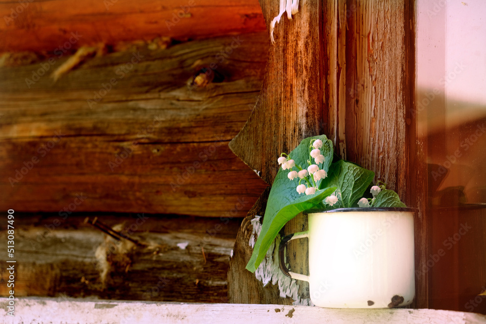 Rustic still life, Summer flowers in enamel cup, old wooden country house background