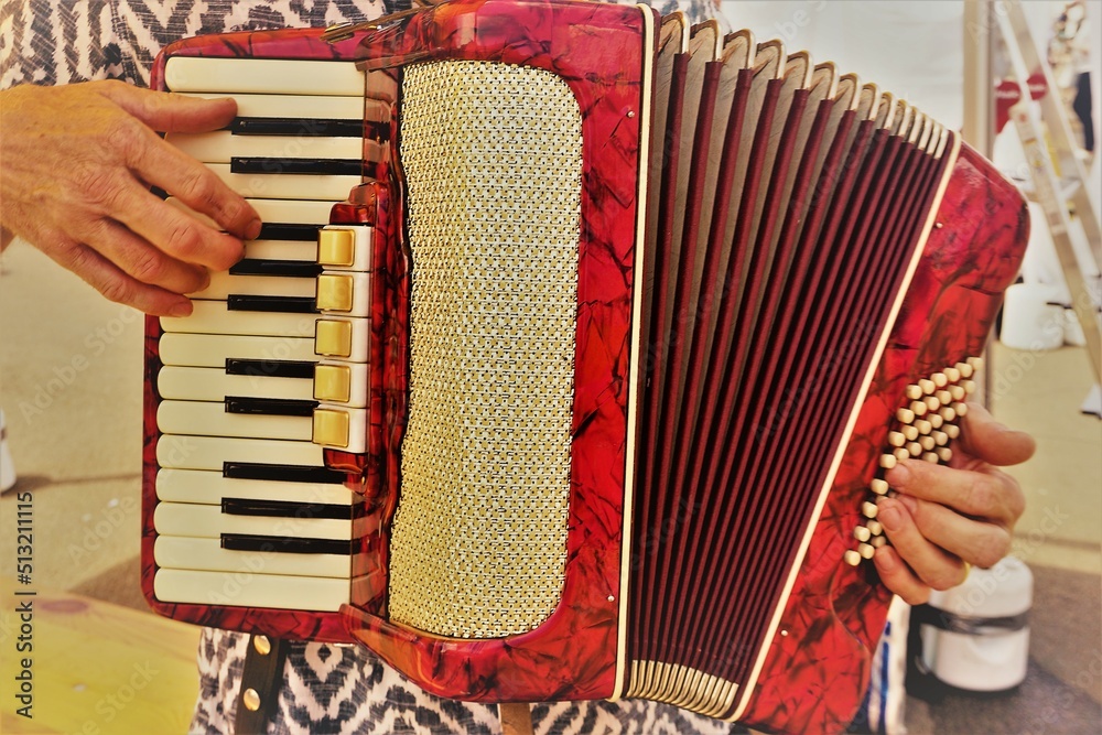 Mann spielt Akkordeon auf Straße in Stadt bei Sonne im Frühling
