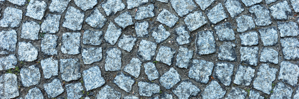 Panoramic image. Circular old cobblestones. Sidewalk made of gray stones