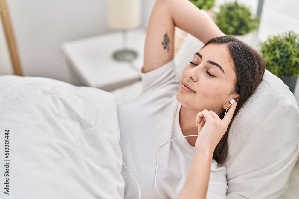 Young hispanic woman listening to music relaxed on bed at bedroom