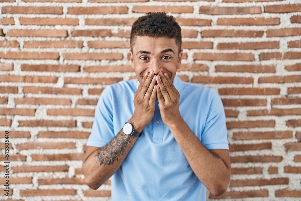 Brazilian young man standing over brick wall laughing and embarrassed giggle covering mouth with hands, gossip and scandal concept