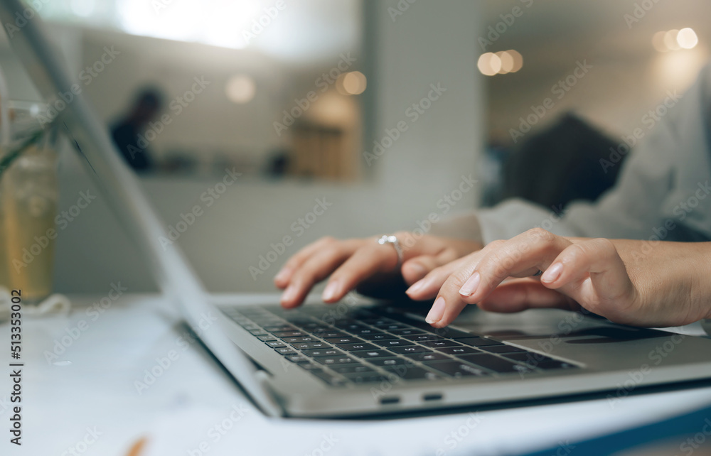 Close up virw, young asian woman typing on keyboard computer to working or meeting online and sent message to her business group