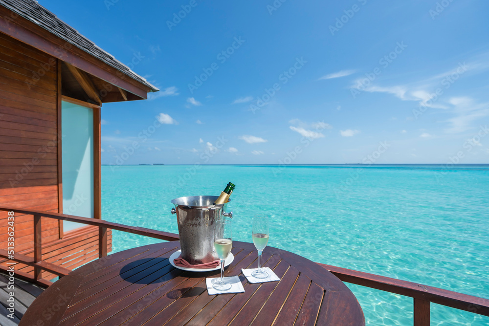 A bottle of champagne with ice bucket on table in over water sweet villa in Maldives island.