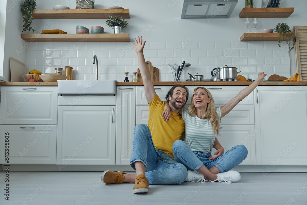 Cheerful couple embracing and keeping arms raised while sitting on the floor at the kitchen