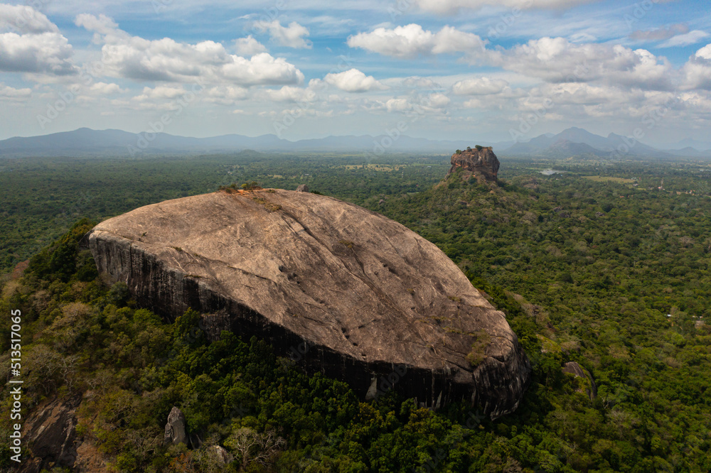 Sigiriya mountain and Pidurangala rock among the dense forest on the island of Sri Lanka. Tropical green forest and jungle.