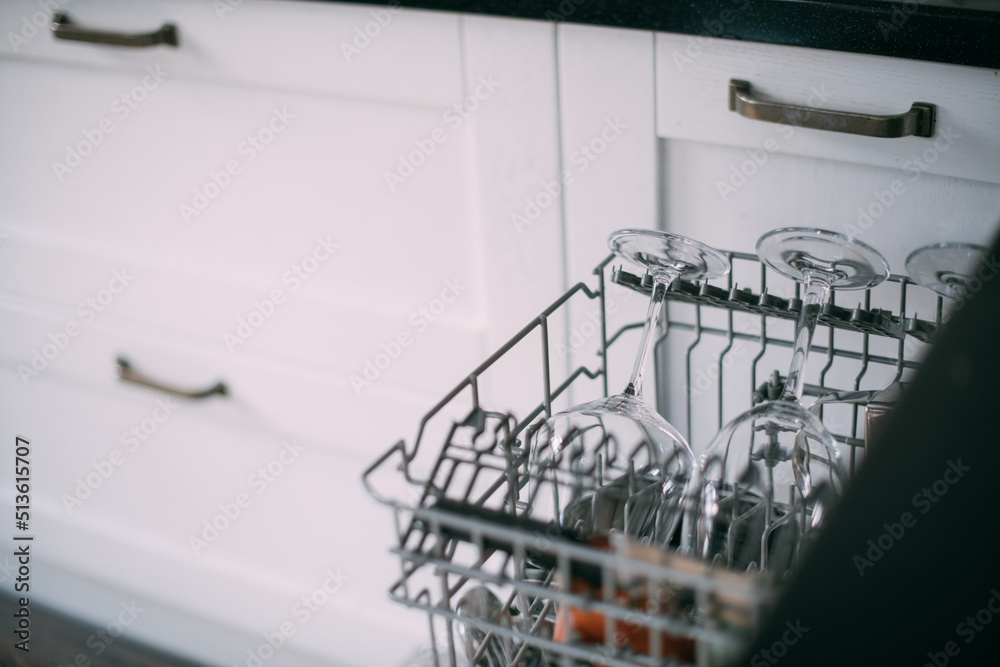 Open dishwasher with clean dishes in a white kitchen. Clean glasses, plates, mugs in the dishwasher basket