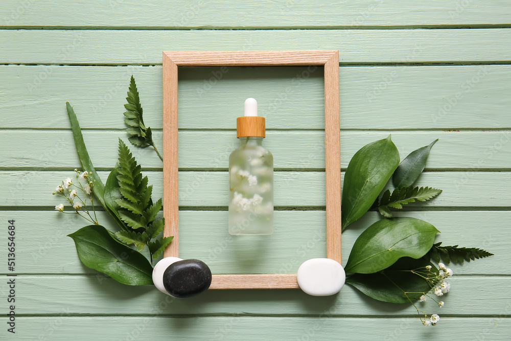 Composition with bottle of serum, empty picture frame and plant leaves on color wooden background