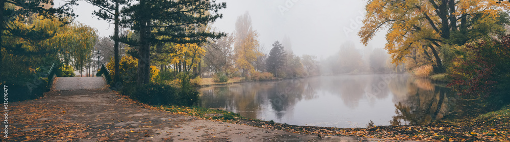 Picturesque panorama of Autumn landscape in park. Foggy sunrise in Vienna Austria park