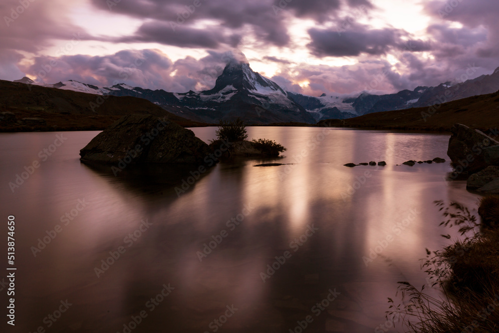 Beautiful sunset colors and cloudscape in the Swiss Alps in summer, with Matterhorn reflection in a lake
