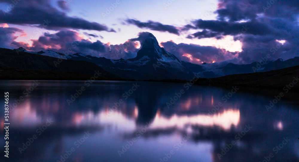 Beautiful sunset colors and cloudscape in the Swiss Alps in summer, with Matterhorn reflection in a lake