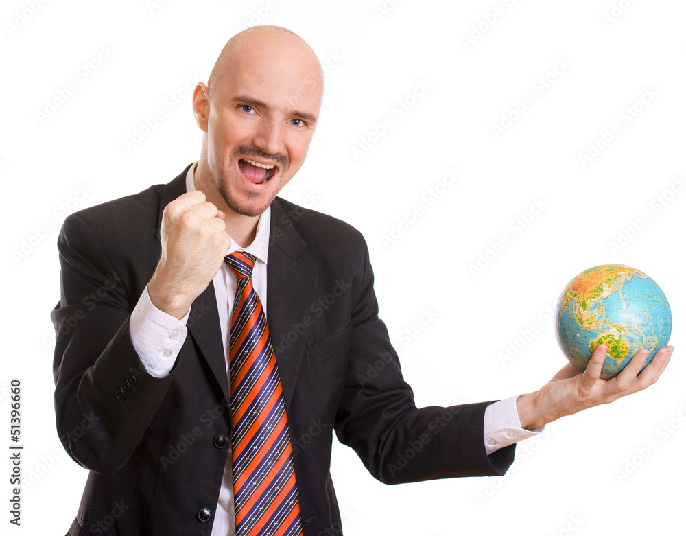 jubelnder Mann hält Erdball in der Hand