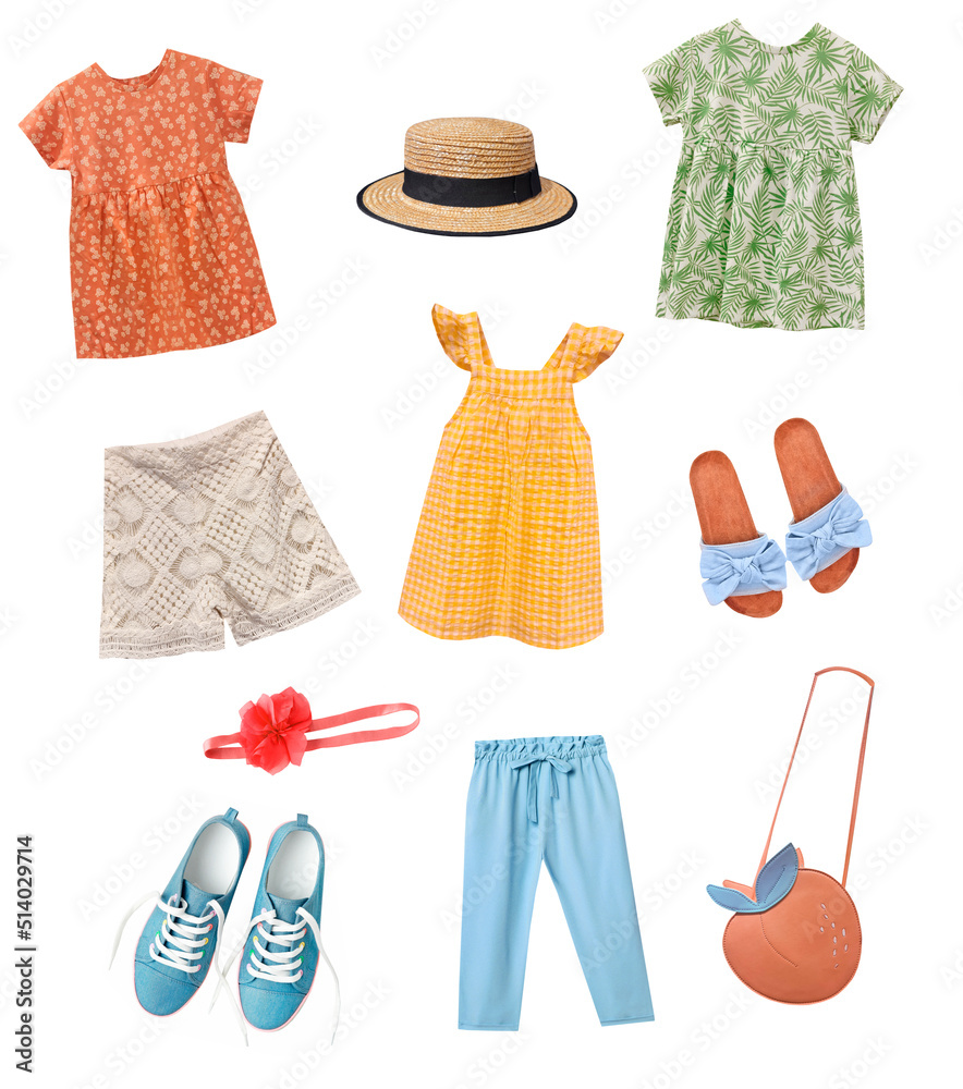 Kid's clothes set isolated.Child girl fashion clothing set.Collage of beautiful apparel.
